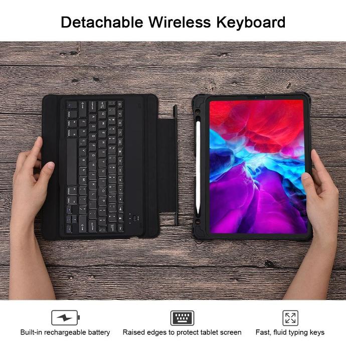 جراب حماية مع لوحة مفاتيح لاسلكية قابلة للفصل مصممة خصيصًا لطرازات iPad Pro مقاس 12.9 إنش التي تم إصدارها في عامي 2018 و 2020. فيما يلي تفصيل لمميزاتها