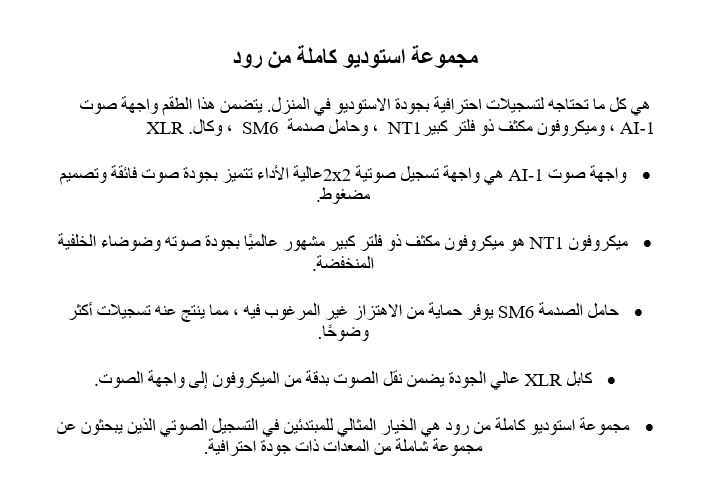 يتضمن ذلك واجهة الصوت AI-1 من RØDE ، وميكروفون مكثف NT1 ، وحامل صدمات SM6 ومرشح . ، وجميع الكابلات التي تحتاجها للاتصال.تأتي كل مجموعة استوديو كاملة أيضًا مع إصدار ، بحيث يمكنك البدء في صنع الموسيقى على الفور.